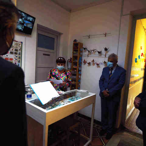 La directora del museo da la bienvenida a la comitiva de la Embajada del Japón y de la Intendencia de Colonia (Crédito: Embajada Japón)